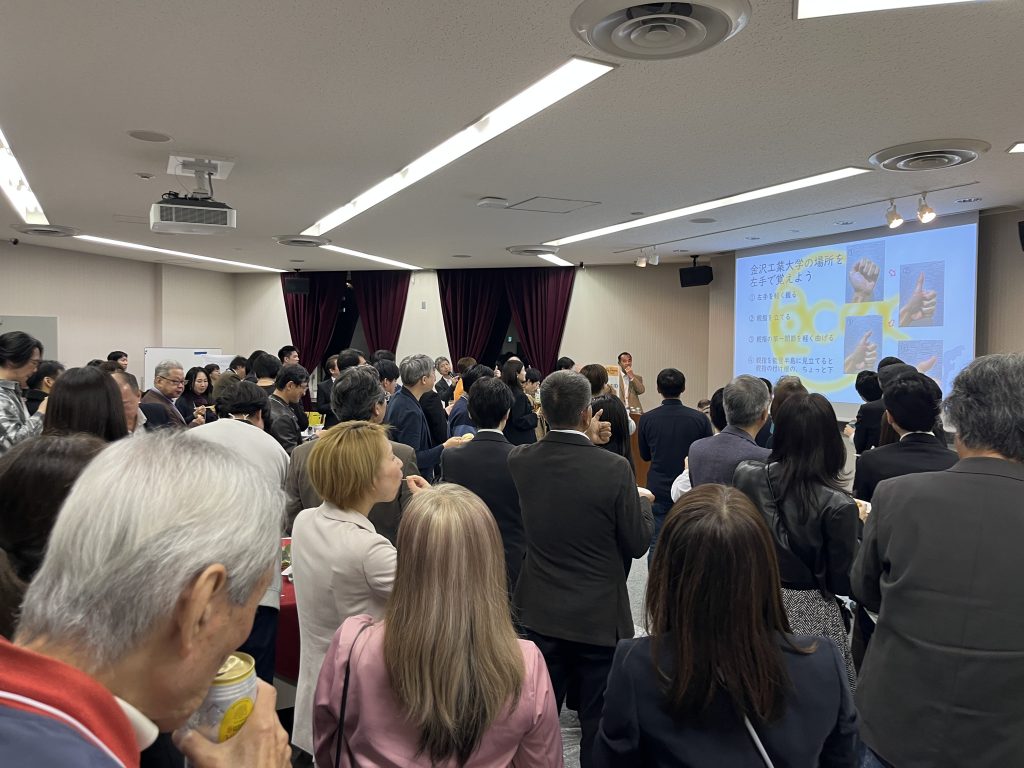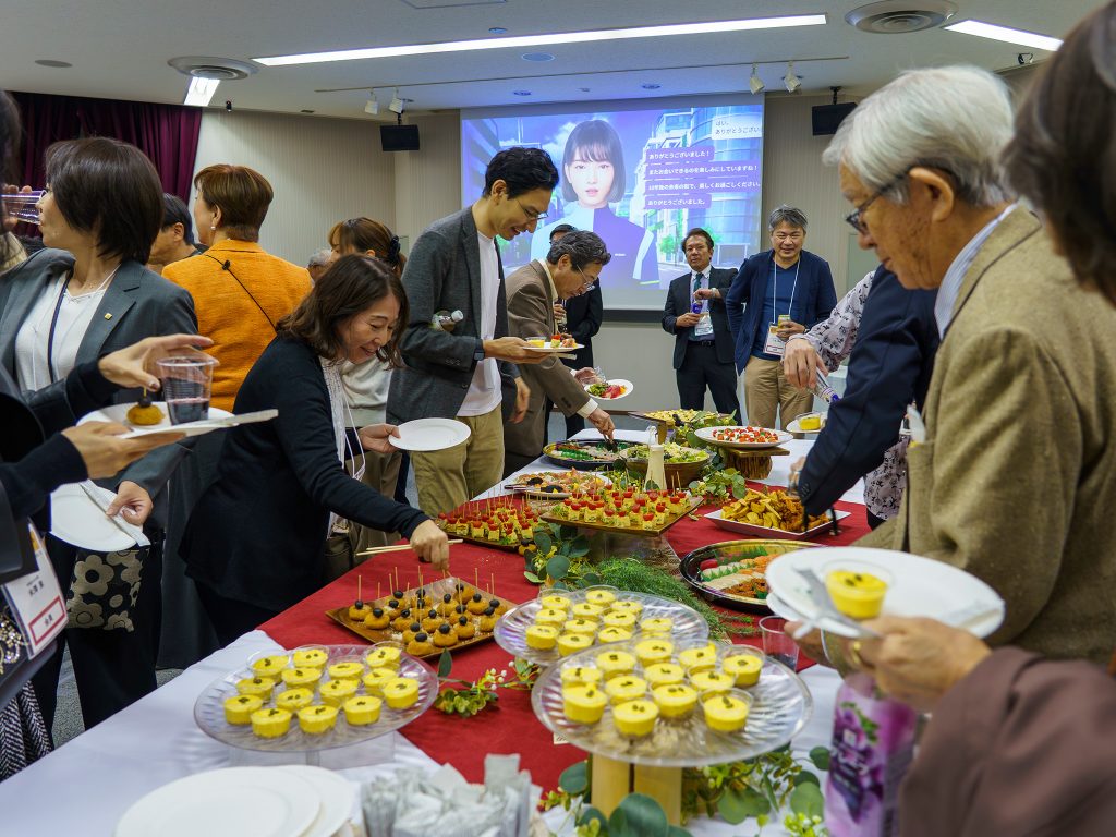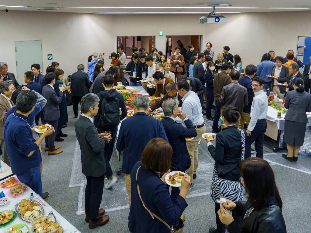 華やかな装飾ときれいに盛り付けられた食事を目にし、多くの参加者が喜んで写真を撮っている場面を多々見受けました。参加者たちは思い思いに交流し賑やかな会となりました。次回大会の大会長 渡邊伸行氏(金沢工業大学)から開催地である金沢工業大学の様子、大会テーマや周辺の観光地等のプレゼンテーションがあり、時折ユーモアのある話題が上がると参加者たちは笑いを交えながら、聞き入っておりました。