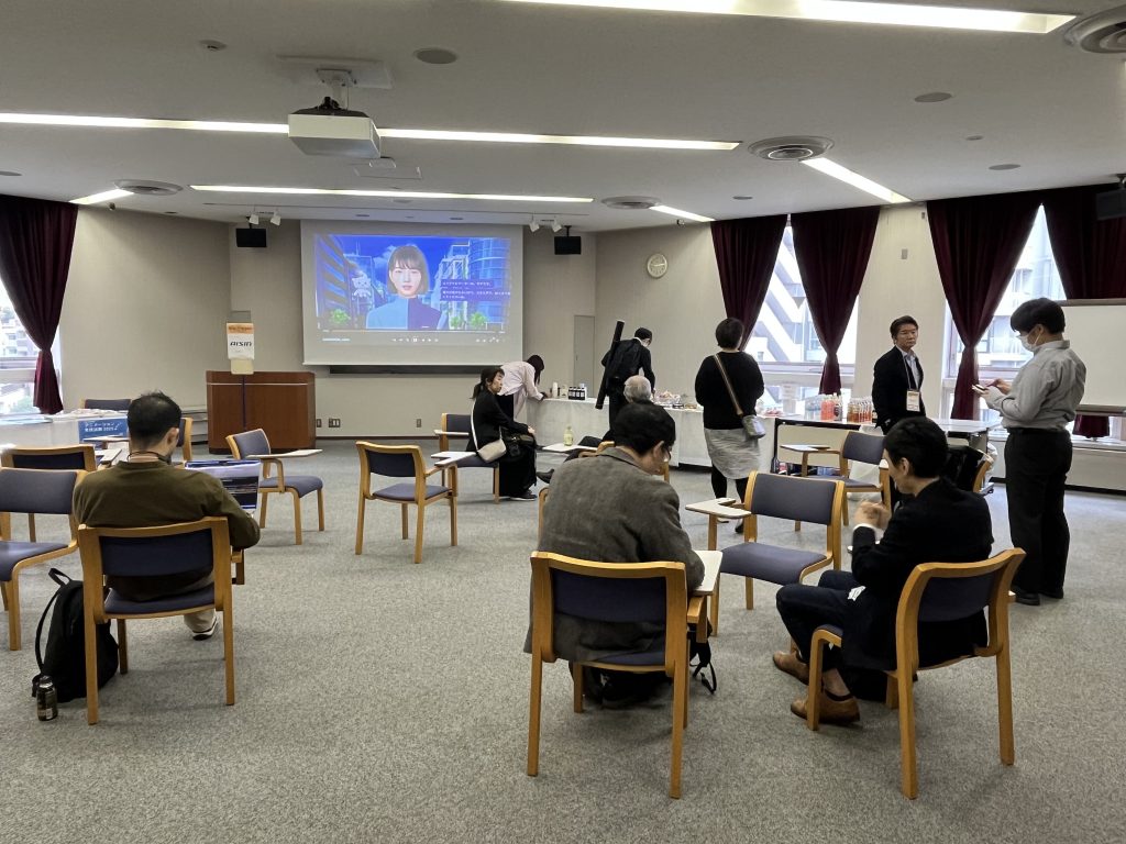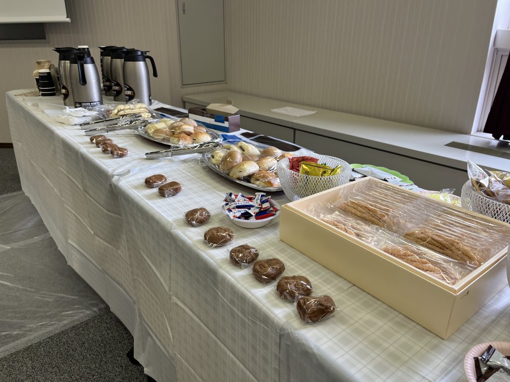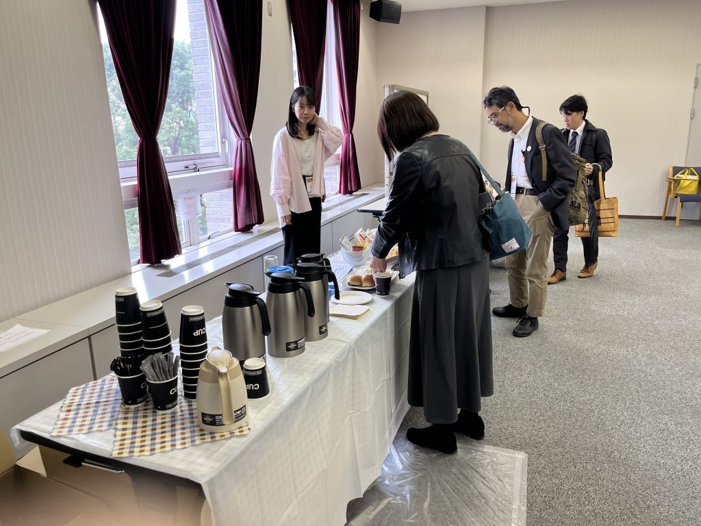 会期中、3階第二会議室ではコーヒーブレイクコーナーを設置。温かいコーヒーをはじめさまざまな種類の飲み物と、パン・お菓子を並べました。発表の合間に休憩しながら参加者のみなさまが快適に過ごせるように努めました。第二会議室では株式会社アイシンさんのデモ映像を上映しておりました。